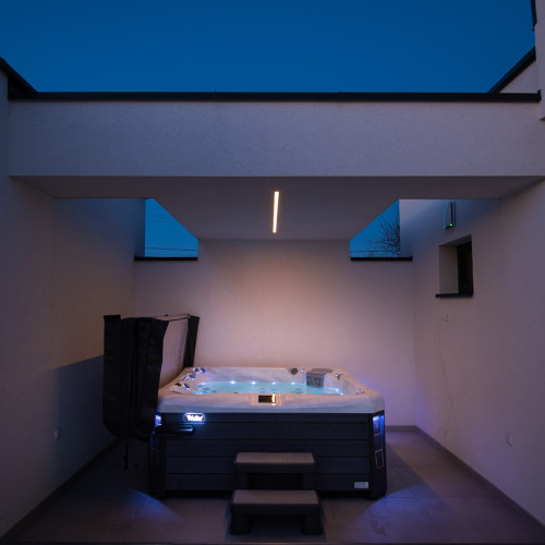 A vízforgatós medence nemcsak látványelem, hanem teljes értékű úszómedenceként is használható. A kert és az udvar 2024 őszén készült el végleges formájában, az ingatlan pedig eladás után friss belső és külső festést kap.