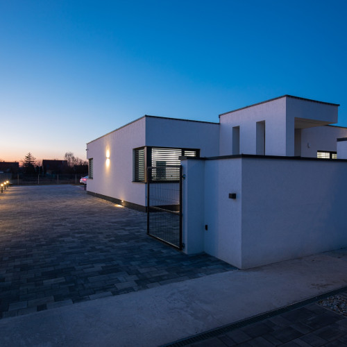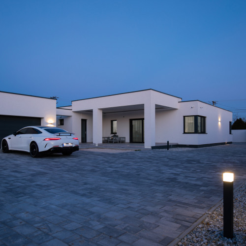 A 2000 m²-es, parkosított kert igazi oázis: olajfák, pálmák és egy automata öntözőrendszer gondoskodnak a pihentető, nyaralásra emlékeztető hangulatról. A telek elrendezése praktikus és látványos egyszerre — több mint 1100 m² zöldfelület és 420 m² térkövezett rész biztosít kényelmet, mozgásteret és eleganciát.