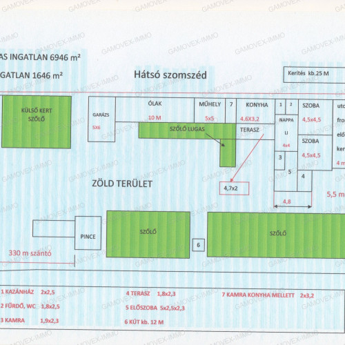 A hatalmas telken rengeteg gyümölcsfa van, például alma, körte, barack, szilva, valamint szépen rendezett szőlőlugas,és még így is van hely egy veteményes számára is.